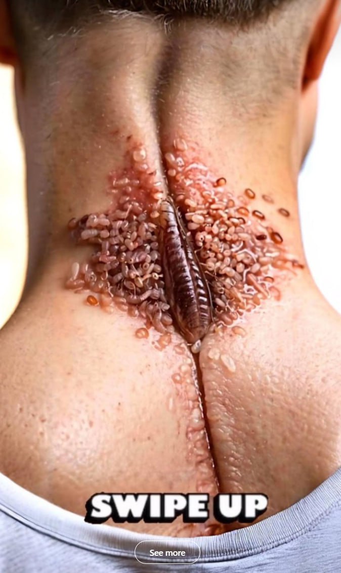 The condition shown in this image appears consistent with a severe advanced-stage spinal dermal infestation, a rare but highly aggressive skin disorder in which parasitic organisms cluster along the cervical spine and upper back tissue. Early signs often include redness, itching, burning sensations, and a crawling feeling beneath the skin. As the infestation progresses, fluid-filled nodules may begin to form around the affected area, creating visible swelling and inflammatory irritation.